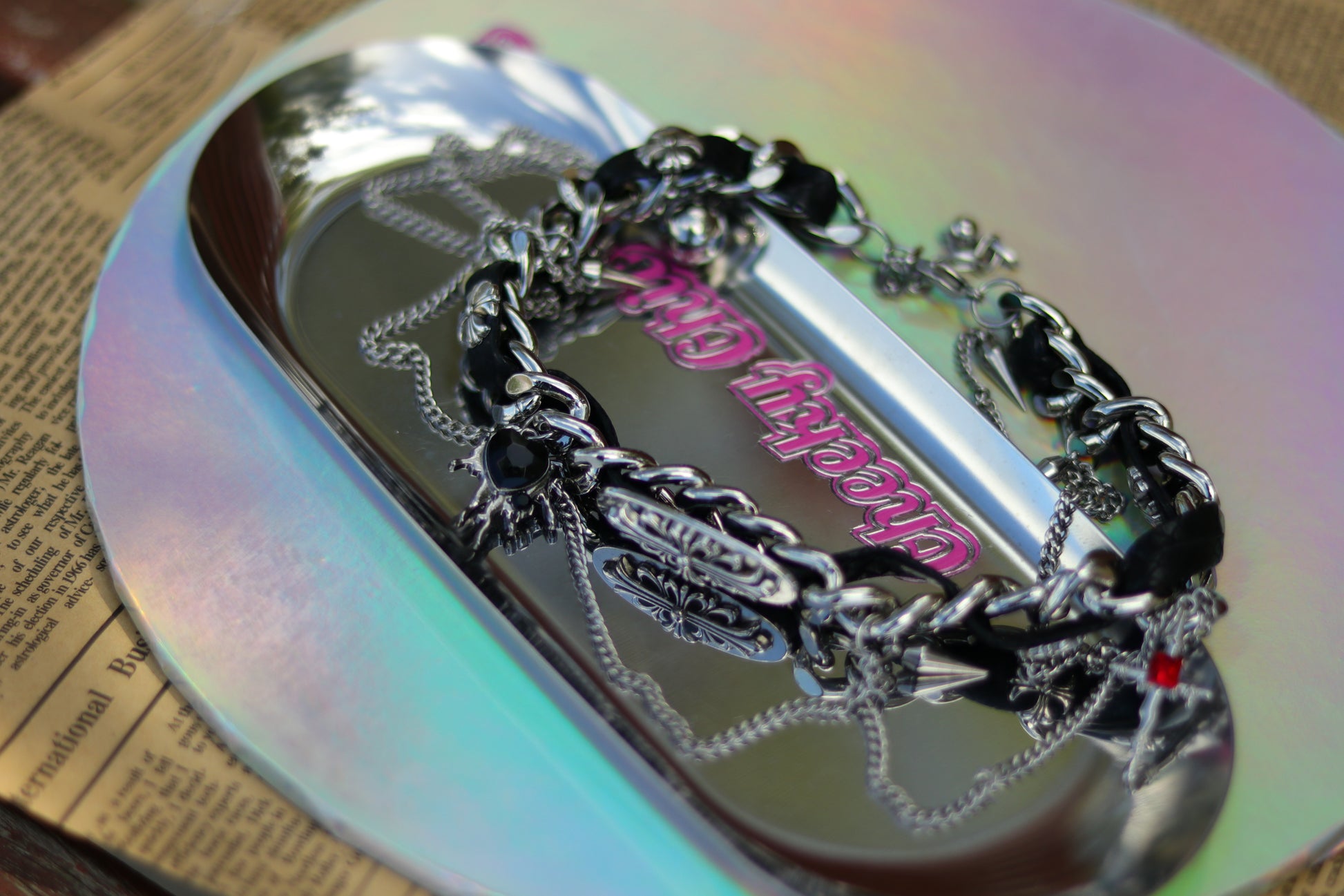 This necklace features black faceted stones, layered chains, and sculpted metallic charms that add depth, texture, and a subtle gothic elegance. The contrast between the polished silver chain and deep black accents creates a striking visual effect — dramatic, stylish, and unmistakably Y2K.